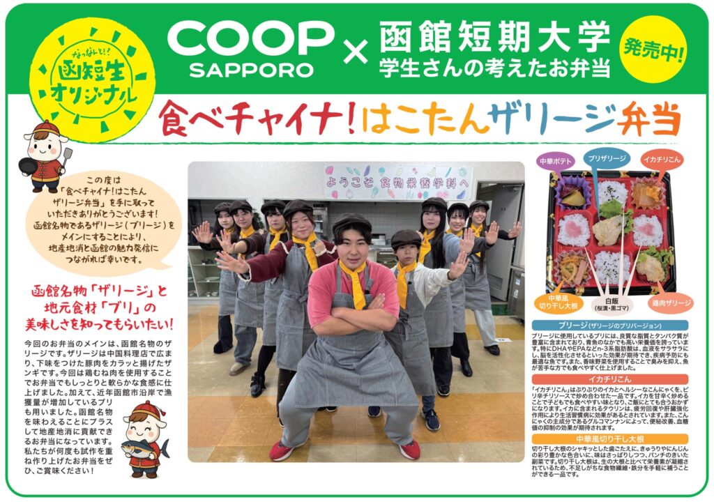 今回のお弁当は、函館名物のザリージをメインに地産地消を意識して開発したお弁当です。また、近年函館で獲れているブリを使用し地産地消にも取り組みました。2月5日(木)の販売初日には、コープさっぽろ湯の川店様ご協力のもとオリジナルキャラクターの飾りつけ、店内アナウンスなどお客様へのアテンド活動を実施させていただきました。