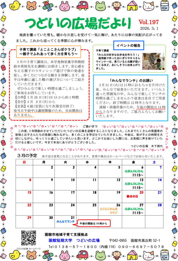 つどいの広場だより Vol.197(3月号) 今月号の内容☆子育て講座「とことこさんぽクラブ」 ~親子でふれあって歩く力を育もう~☆イベントの報告☆「みんなでランチ」のお誘い☆ごあいさつ☆3月の予定